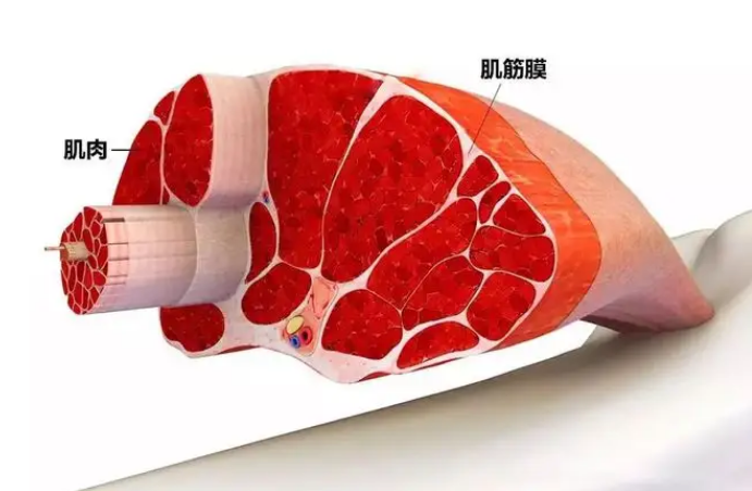 筋膜可以简单理解为包裹我们全身肌肉骨骼的一层网状结构,就是包裹着肌肉、血管、神经的一层结缔组织,具有弹性、黏滞性、刚性、延展性。大家切过肉的应该有印象,就是白白的这个玩意儿。