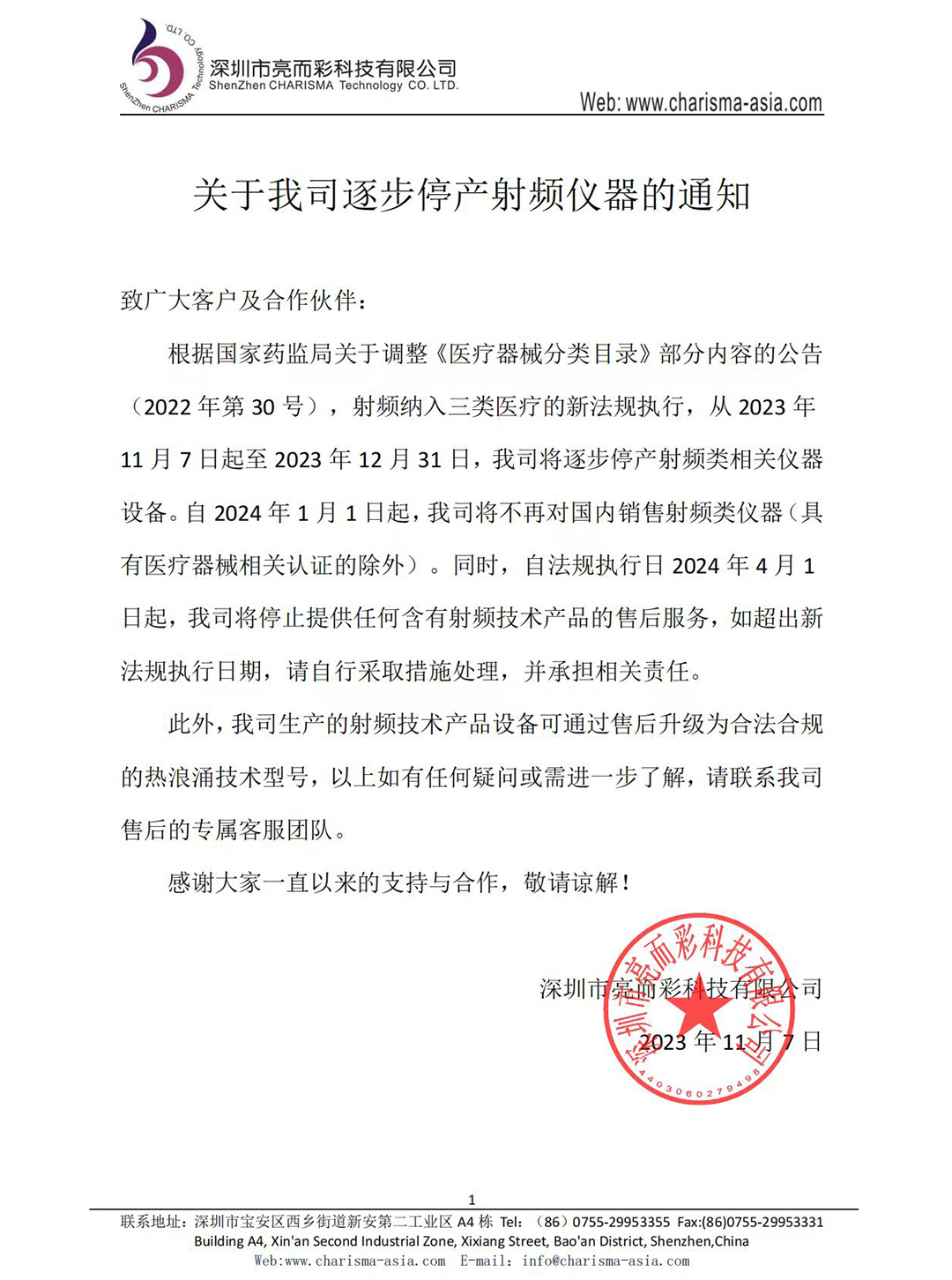 关于我司逐步停产射频仪器的通知